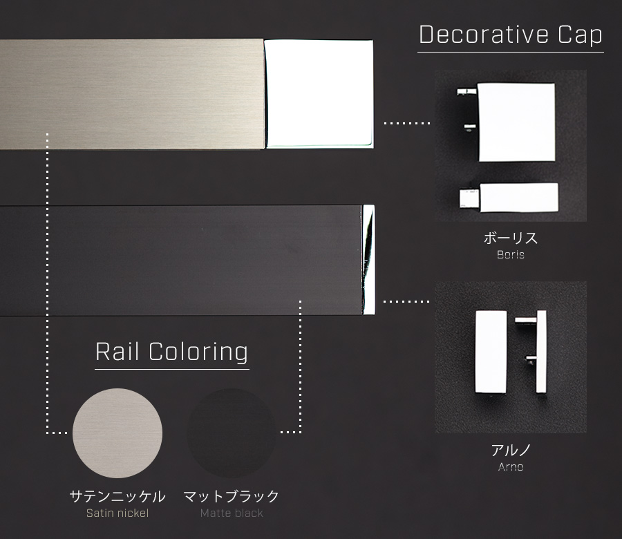 レールカラーはほんのりベージュがかったマットなサテンニッケルと、艶消しの黒がかっこいいブラックアイアン風なマットブラックの2色。