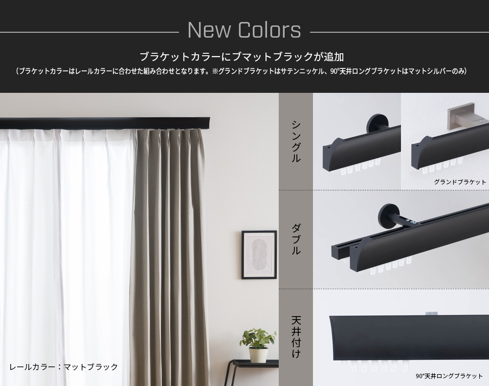 レールカラーはほんのりベージュがかったマットなサテンニッケルに艶消しの黒がかっこいいブラックアイアン風なマットブラックが新たに仲間入り。エンドキャップは出幅は3mmと敢えてシンプルな一種類のみです。キャップカラーはお選びいただいたレールカラーと同色のものとなります。